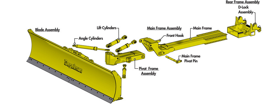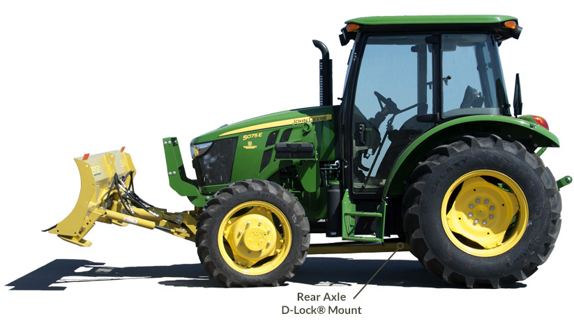 The D-Lock® mounting system offers the convenience of quick attach/detach as well as long life. No tools are required. Fit-ups are 100% secure with zero movement. The blade can be removed in minutes by disengaging two points on the front axle brackets.