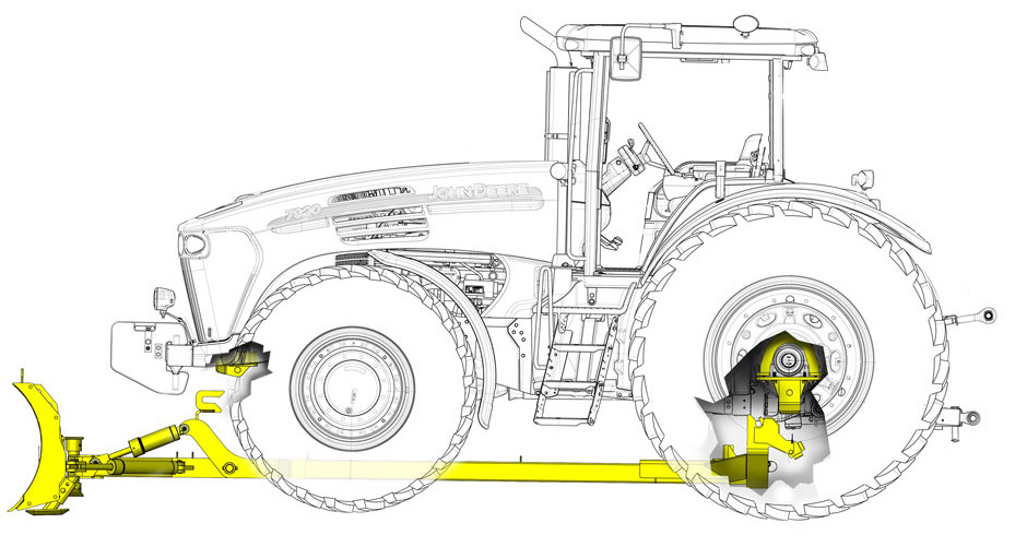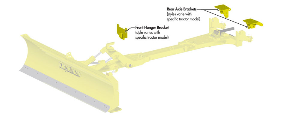 3500 Blades commonly mount using a front mounted hook and two rear axle brackets. The operator typically drives into the front hook, connects the hydraulics, hydraulically lifts the rear frame into position, and secures the "D-Lock" connections on the rear axle brackets. (46/5700 shown in illustration)