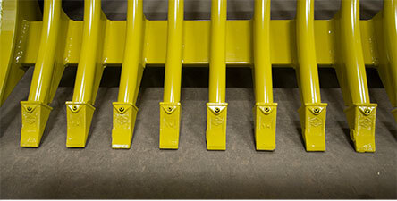 The grill teeth on the Rock King are made of round solid C1045 steel shafts. This steel is much stronger than ordinary mild steel and has a natural spring to it to resist impact damage. A Degelman grill is extra heavy, developed with the optimum sweeps and curves to separate rocks from stones. Every third tooth is welded to the frame to allow small lodged rocks to clear freely. The round profile itself is also the optimum shape with the smallest choke point to minimize jams.