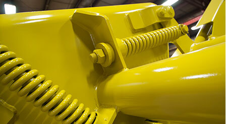 The reel spring assembly moves constantly under heavy loads and is designed to arc back under pressure and release. The spring is a heavy-duty compression design exclusive to Degelman, which has taken years to perfect. It works better and lasts longer than typical extension springs. Paired with this is a urethane puck that dampens vibration and minimizes backlash as the reel paddle decompresses. Finally, a simple bend integrated into the spring holder plate greatly increases the strength of the spring holder.