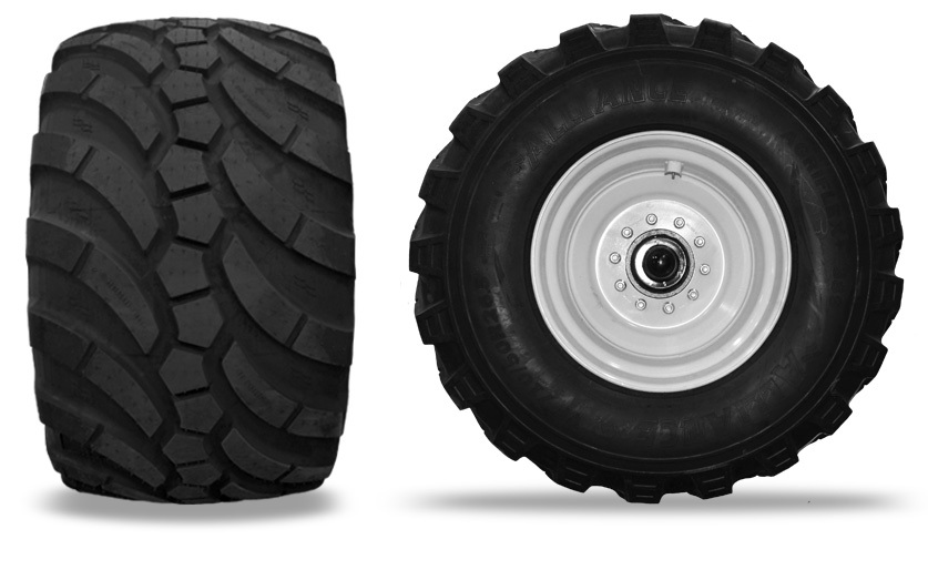 Distributing weight and minimizing the pounds per square foot in soft wet conditions is necessary. These large diameter tires disperse the weight of rocks in the hopper and reduce the possibility of heavy rutting on your valuable fields.